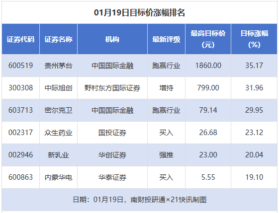 南财投研通数据显示,1月19日,券商给予上市公司目标价共6次,按最新收盘价计算,目标价涨幅排名居前的公司有贵州茅台、中际旭创、密尔克卫,目标价涨幅分别为35.17%、31.96%、29.95%,分别属于白酒、通信设备、物流行业。