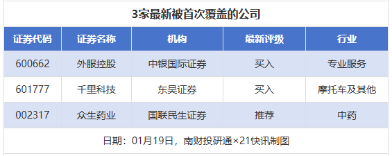 首次覆盖方面,1月19日券商共给出了3次首次覆盖,其中外服控股获得中银国际证券给予“买入”评级,千里科技获得东吴证券给予“买入”评级,众生药业获得国联民生证券给予“推荐”评级。