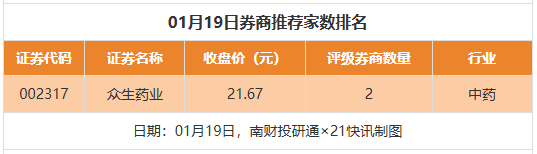 从券商推荐家数来看,1月19日有17家上市公司得到券商推荐,其中众生药业获得2家推荐,内蒙华电、外服控股等均获得1家推荐。