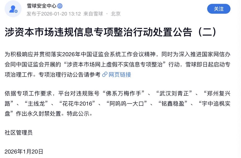 1月20日,雪球安全中心一天之内发布了三则涉资本市场违规信息专项整治行动处置公告称,为深入推进国家网信办会同证监会开展的“涉资本市场网上虚假不实信息专项整治”行动,雪球即日起启动专项治理工作。