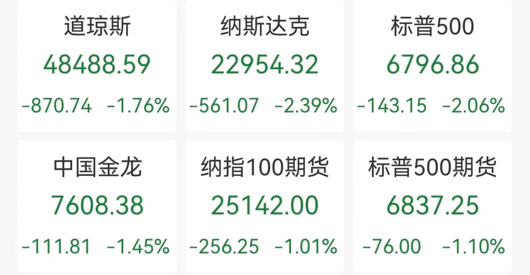 周二(1月20日),美国三大股指全线收跌,标普500指数、纳指跌超2%,道指跌870点,跌幅1.76%,