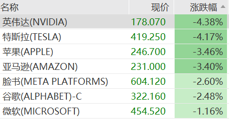 大型科技股全线下跌,英伟达、特斯拉跌超4%,苹果、亚马逊跌超3%。