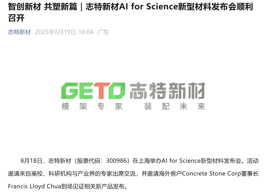 同时,志特新材还在2025年半年报中透露,已与高校实验室合作,借助AI for Science新范式优化智能研发平台,持续提升材料性能研发效率,加速高性能建筑新材料的市场化应用进程。