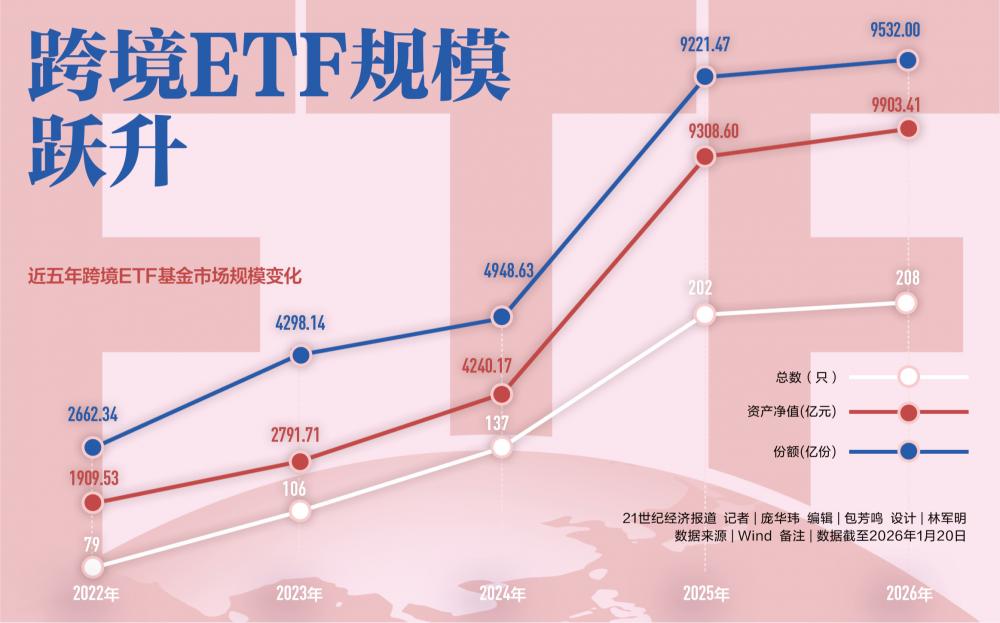 格上基金数据显示,跨境ETF自2021年起持续高速增长,年均复合增长率超过80%。截至2026年1月20日,全市场跨境ETF总规模达9903.82亿元。