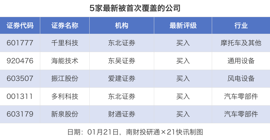 首次覆盖方面,1月21日券商共给出了5次首次覆盖,其中千里科技、多利科技获得东北证券均给予“买入”评级,海能技术获得东吴证券给予“买入”评级,振江股份获得爱建证券给予“买入”评级,新泉股份获得财通证券给予“买入”评级。