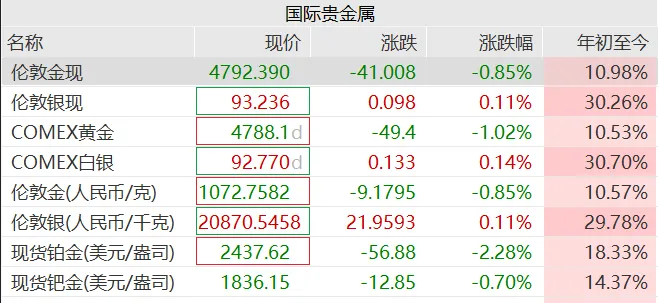 下跌方面,贵金属概念冲高回落,西部黄金、晓程科技均跌超5%。消息面上,随着美国和欧洲围绕格陵兰岛的紧张关系缓解,避险情绪降温,黄金、白银价格出现跳水。其中,现货黄金一度跌超1%,现货白银一度跌超2%。截至发稿,现货黄金及白银的跌幅均有所收窄。值得注意的是,高盛将2026年12月黄金价格预期上调500美元,至每盎司5400美元。