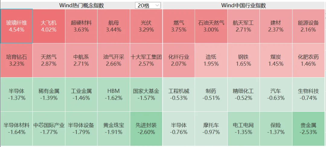 从板块来看,石油石化、国防军工、建筑材料等板块走强,大飞机、天然气、航母、玻璃纤维等概念方向领涨;有色金属、美容护理板块回调。