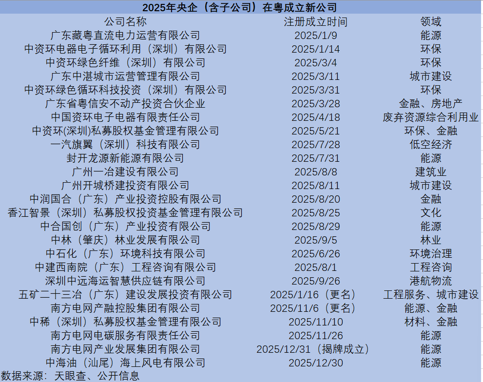 据不完全统计,仅2025年一年,央企(含子公司)在广东至少成立了25家新公司。