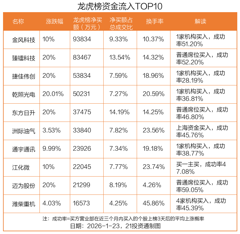 1月23日,上证指数上涨0.33%,深证成指上涨0.79%,创业板指上涨0.63%。盘后龙虎榜数据显示,共有55只个股因当日异动登上龙虎榜,资金净流入最多的是金风科技(002202.SZ),达9.38亿元。