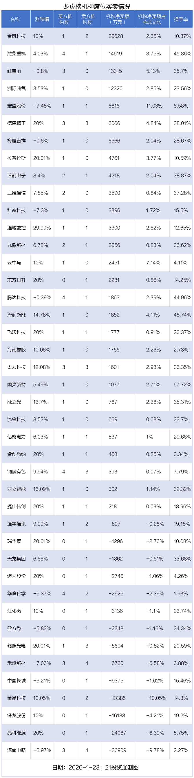 1月23日,42只个股龙虎榜出现了机构的身影,机构合计净卖出3545.56万元。具体来看,机构净买入28股,净卖出14股。