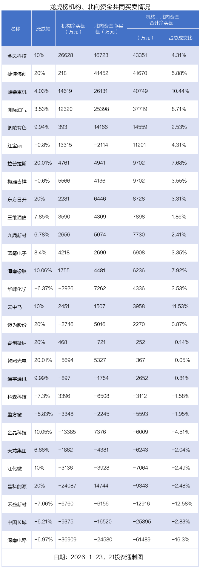 值得注意的是,机构和北向资金共同净买入了捷佳伟创、潍柴重机、洲际油气、金风科技、铜陵有色、东方日升、九鼎新材、拉普拉斯、海南橡胶、三维通信、梅雁吉祥、蓝箭电子、云中马等13股;共同净卖出了通宇通讯、盈方微、江化微、天龙集团、禾盛新材、中国长城、深南电路等7股;在晶科能源,金晶科技,华峰化学,乾照光电,迈为股份,睿创微纳,红宝丽,科森科技上出现分歧,机构净卖出晶科能源2.41亿元,北向资金净买入1.47亿元;机构净卖出金晶科技1.34亿元,北向资金净买入7376.14万元;机构净卖出华峰化学2926.25万元,北向资金净买入7262.34万元;机构净卖出乾照光电5694.45万元,北向资金净买入5327万元;机构净卖出迈为股份2746.18万元,北向资金净买入5016.07万元;机构净买入睿创微纳468.47万元,北向资金净卖出720.55万元;机构净买入红宝丽1.33亿元,北向资金净卖出2114.47万元;机构净买入科森科技3396.13万元,北向资金净卖出6508.23万元。