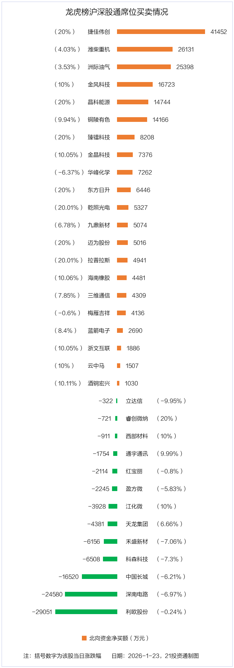 1月23日,北向资金参与龙虎榜中的个股共有34只,合计净买入10.91亿元。其中沪股通净买入10 股,净卖出4 股,合计净买入6.22亿元;深股通净买入11 股,净卖出9 股,合计净买入4.69亿元。