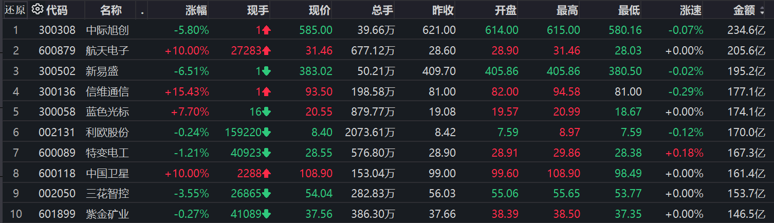个股方面,中际旭创、航天电子成交额超200亿元,分别为234.6亿元和205.6亿元,新易盛、信维通信、蓝色光标等成交额靠前。