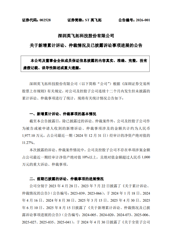 公开资料显示,ST英飞拓目前已处于“戴帽”状态,经营状况本就面临较大压力。此次新增的赔偿支出及持续发酵的诉讼事项,不仅会直接影响公司的现金流及净资产水平,还可能对公司的市场信誉、融资能力等造成多重影响。公司在公告中未明确表示是否会对一审判决提起上诉,仅提示投资者相关诉讼事项存在不确定性,后续将根据案件进展及时履行信息披露义务。