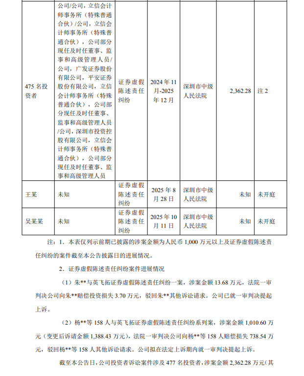 公告明确披露,截至本次公告披露日,公司已收到多起证券虚假陈述责任纠纷案件的相关法律文书。其中核心进展为,法院已对首批159名投资者提起的索赔案件作出一审判决,认定ST英飞拓存在证券虚假陈述行为,判决公司向该批投资者合计支付赔偿款742.24万元,平均每位投资者获赔金额约4.67万元。