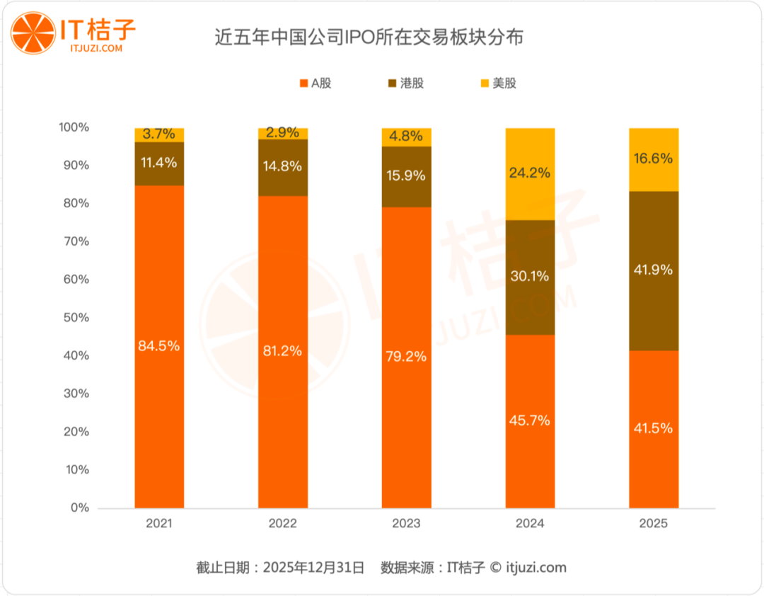 A股IPO数量占总体的比例从2021年高达84.5%下滑,至2025年已降至41.5%。