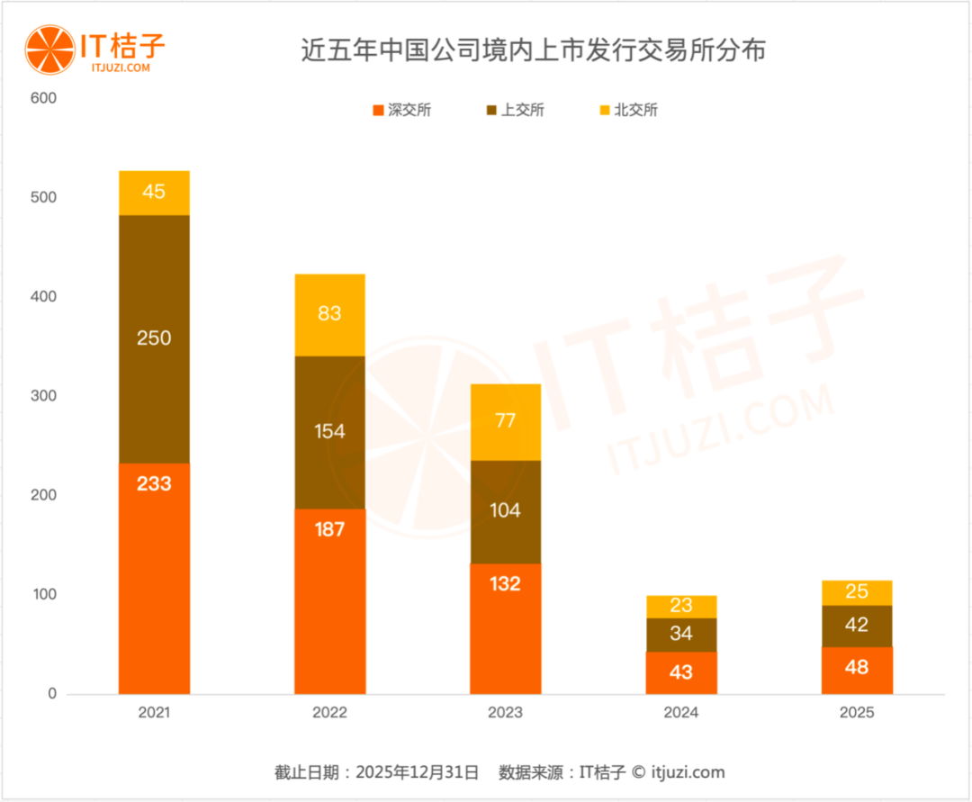上交所的IPO数量占比从2021年的51.7%降至2025年的46.6%,优势减弱。