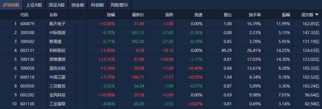 个股方面,航天电子成交额超162亿元居首,中际旭创、新易盛、利欧股份成交额靠前。