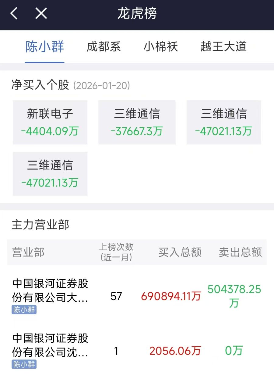 与此同时,知名游资陈小群身陷舆论风波。其被市场认为关联的主力营业部“中国银河证券大连黄河路营业部”,成了部分散户心中的“追涨风向标”。日前,商业航天等热门题材遇冷调整,一众所谓的“陈小群概念股”也同步大跌,此前盲目跟风的部分投资者被深度套牢。随后,引发了市场等对龙虎榜信息、游资监管边界的讨论。