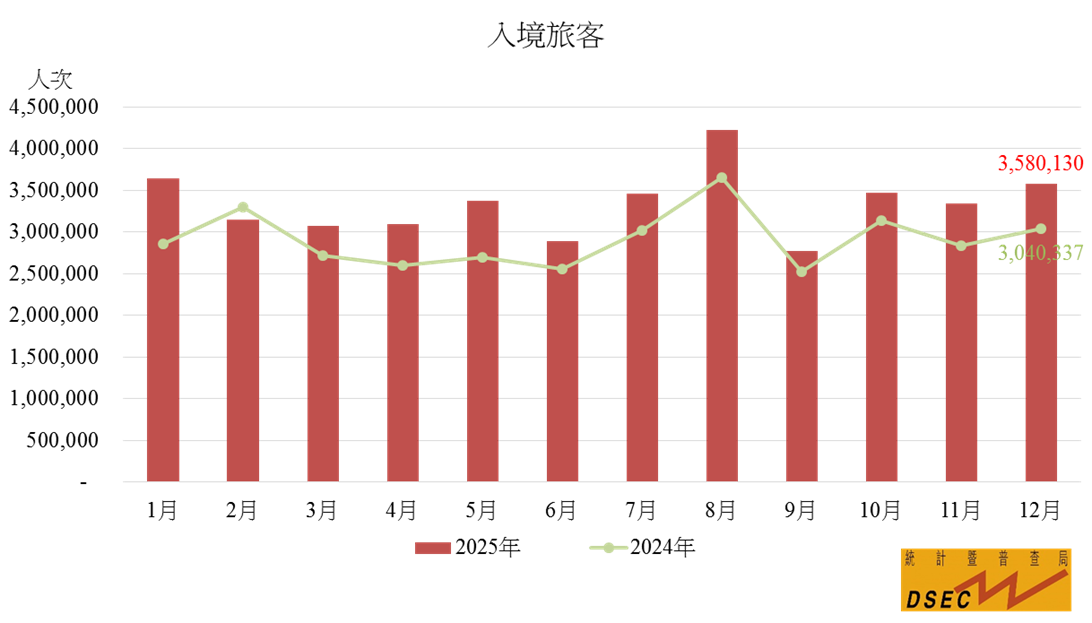 单计2025年12月,入境旅客共3,580,130人次,按年上升17.8%,不过夜及留宿旅客分别增加23%及10.9%。当月旅客平均逗留时间为0.9日,同比减少0.2日,主要因留宿旅客平均逗留时间缩短所致。