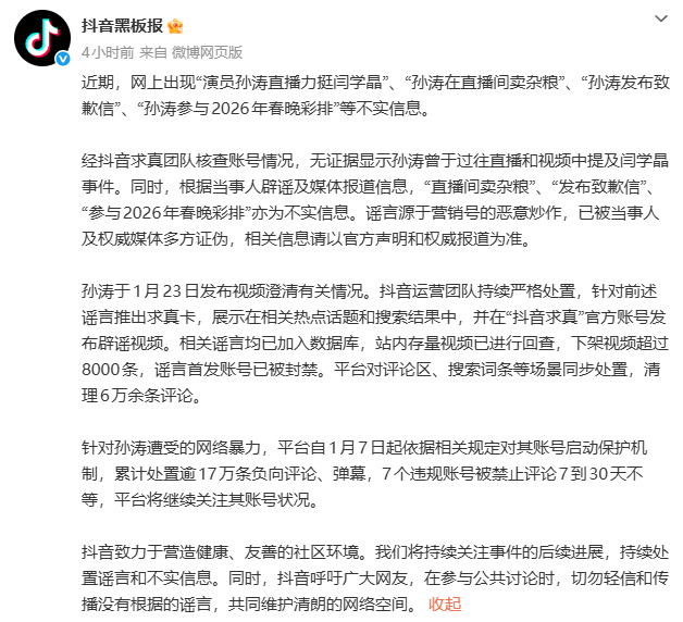 孙涛于1月23日发布视频澄清有关情况。抖音运营团队持续严格处置,针对前述谣言推出求真卡,展示在相关热点话题和搜索结果中,并在“抖音求真”官方账号发布辟谣视频。相关谣言均已加入数据库,站内存量视频已进行回查,下架视频超过8000条,谣言首发账号已被封禁。平台对评论区、搜索词条等场景同步处置,清理6万余条评论。