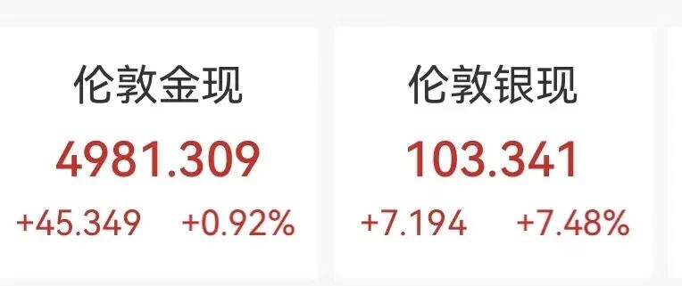 美元走弱助推了金属市场的强势表现, 现货黄金小幅上涨,现货白银强势拉升超7%,报103.341美元/盎司。