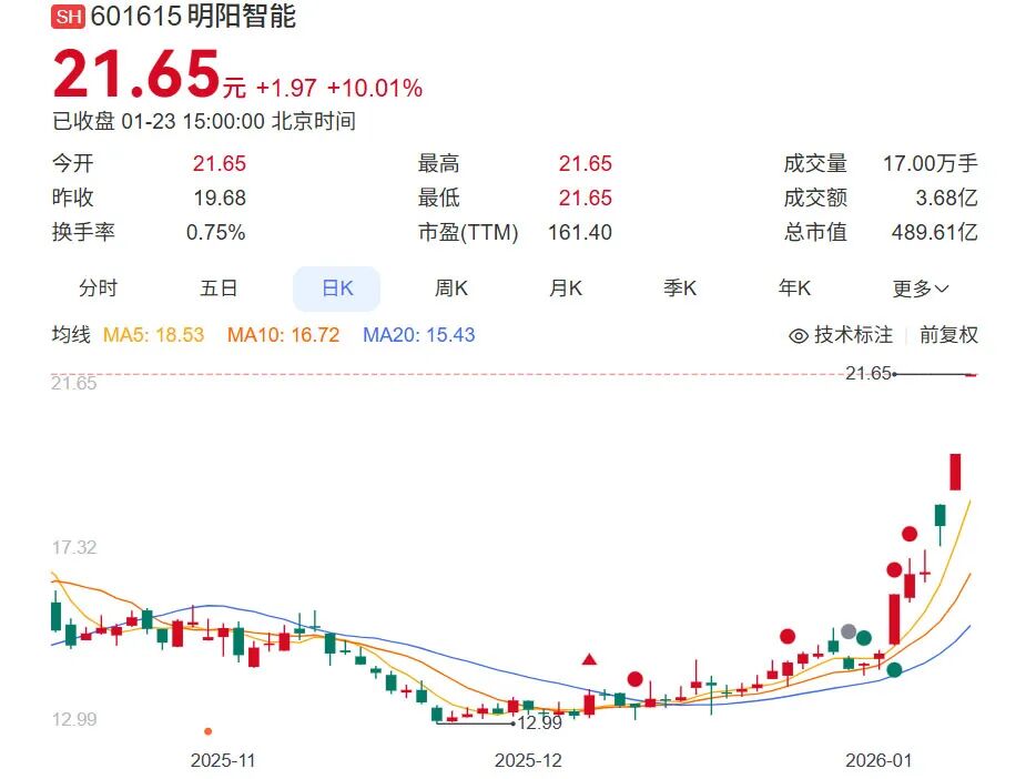 1月23日,明阳智能复牌,收获一个涨停,市值升至490亿元。