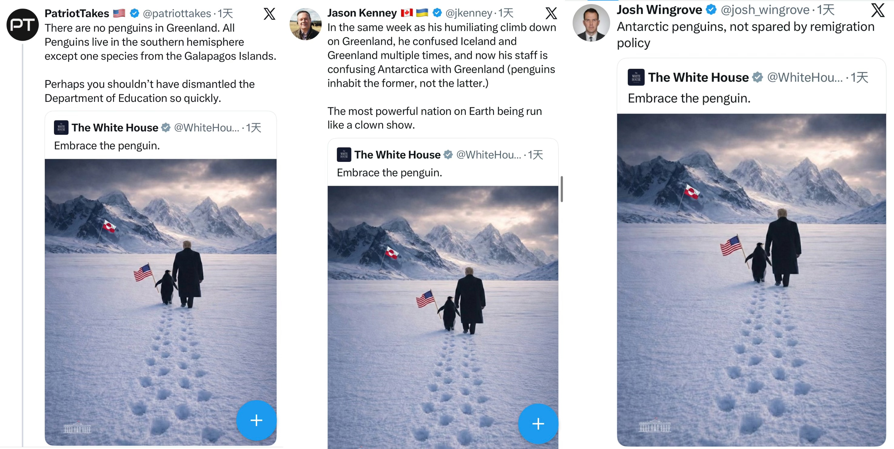 拥有46万多粉丝的X账号“Patriot Takes”回应道:“格陵兰岛没有企鹅……也许你不应该这么快就解散教育部。”
