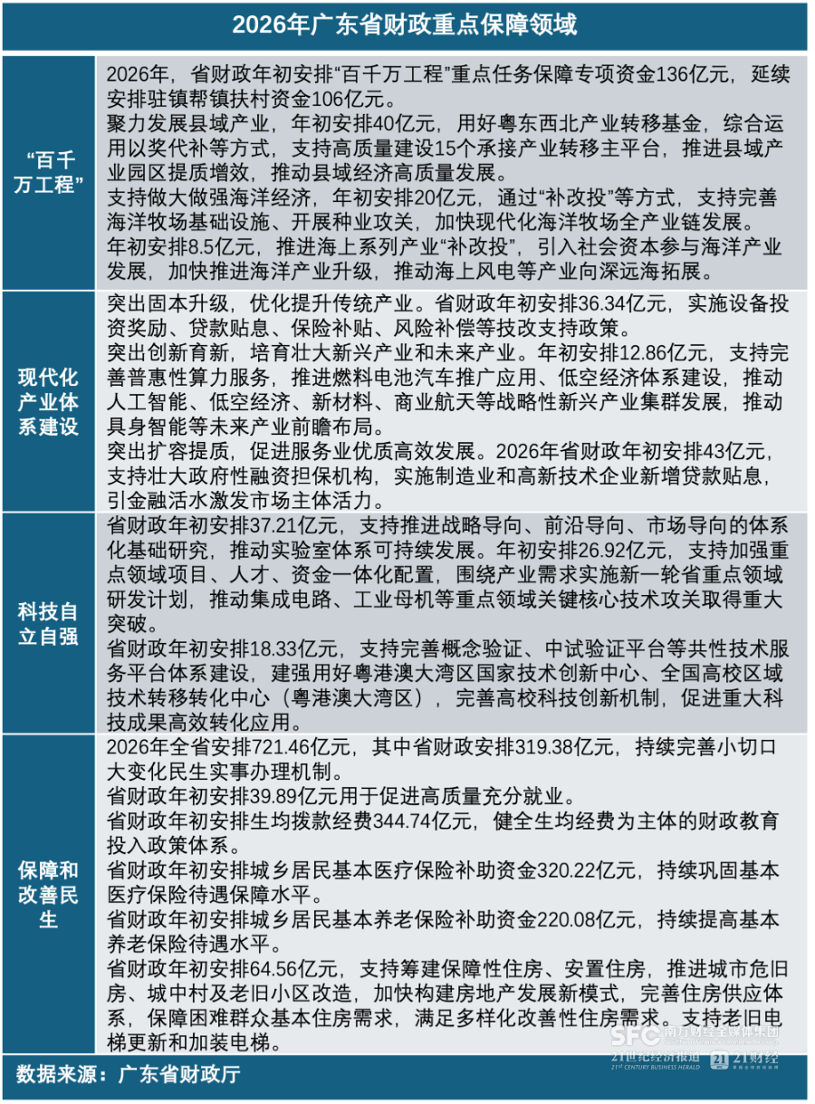 在支持保障和改善民生方面,2026年,广东全省将安排721.46亿元,其中省财政安排319.38亿元,持续完善小切口大变化民生实事办理机制,聚焦群众急难愁盼,落细落小,办好省十件民生实事。