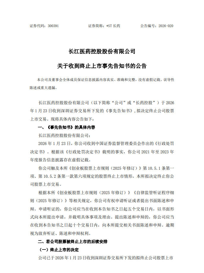 2026年1月23日,长江医药控股股份有限公司(*ST长药,证券代码:300391)面临多重问题,不仅正式收到中国证券监督管理委员会(以下简称中国证监会)作出的行政处罚决定书,确认连续三年财务造假合计被罚4100万元,更收到深交所出具的终止上市事先告知书。目前,公司股票已停牌,A股又一例重大违法退市案例浮出水面。