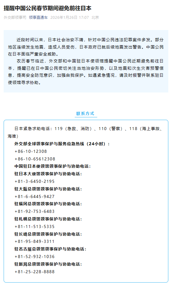 农历春节临近,外交部和中国驻日本使领馆提醒中国公民近期避免前往日本,提醒已在日中国公民密切关注当地治安形势,以及地震和次生灾害预警信息,提高安全防范意识,加强自我保护。如遇紧急情况,请及时报警并联系驻日使领馆寻求协助。