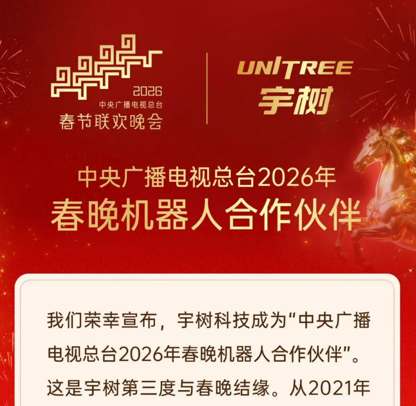 据宇树科技官方微信公众号最新消息, 其成为"中央广播电视总台2026年春晚机器人合作伙伴"。 这是宇树第三度与春晚结缘。