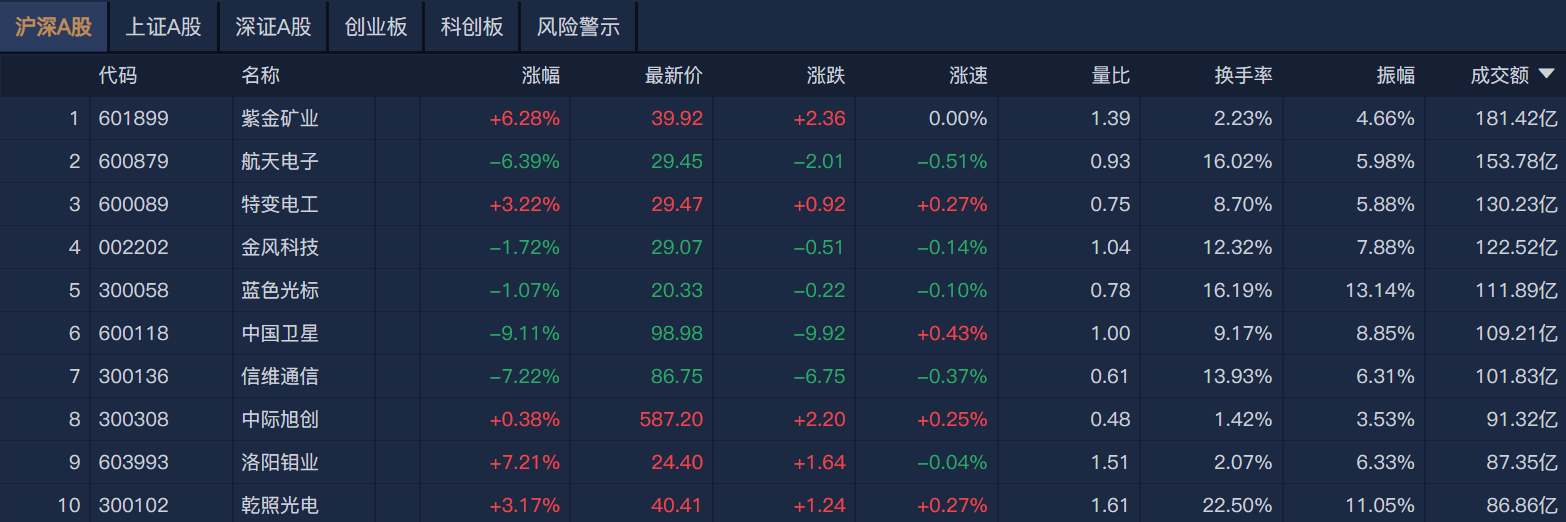 南财金融终端显示,个股方面,紫金矿业半日成交额超181亿元居首,航天电子、特变电工、金风科技成交额靠前。