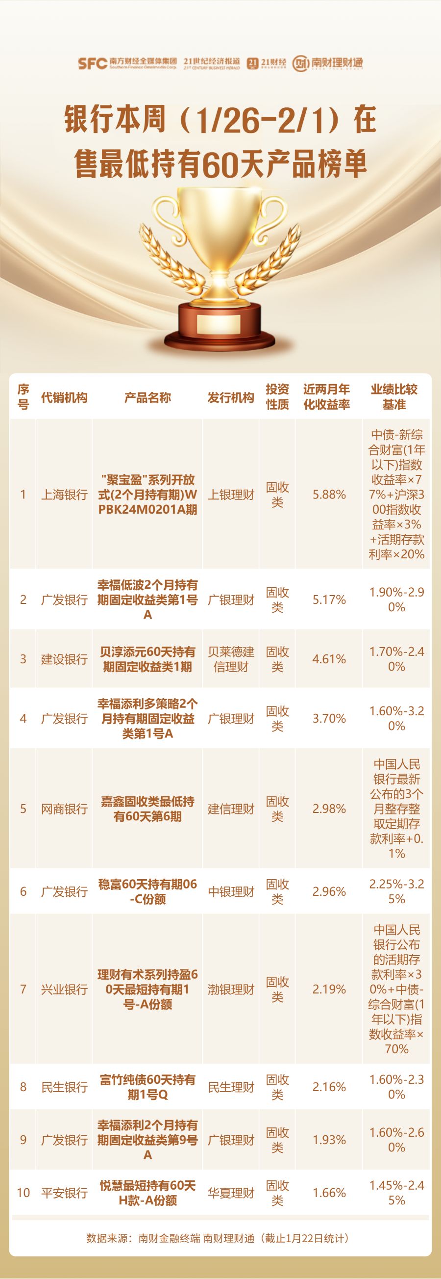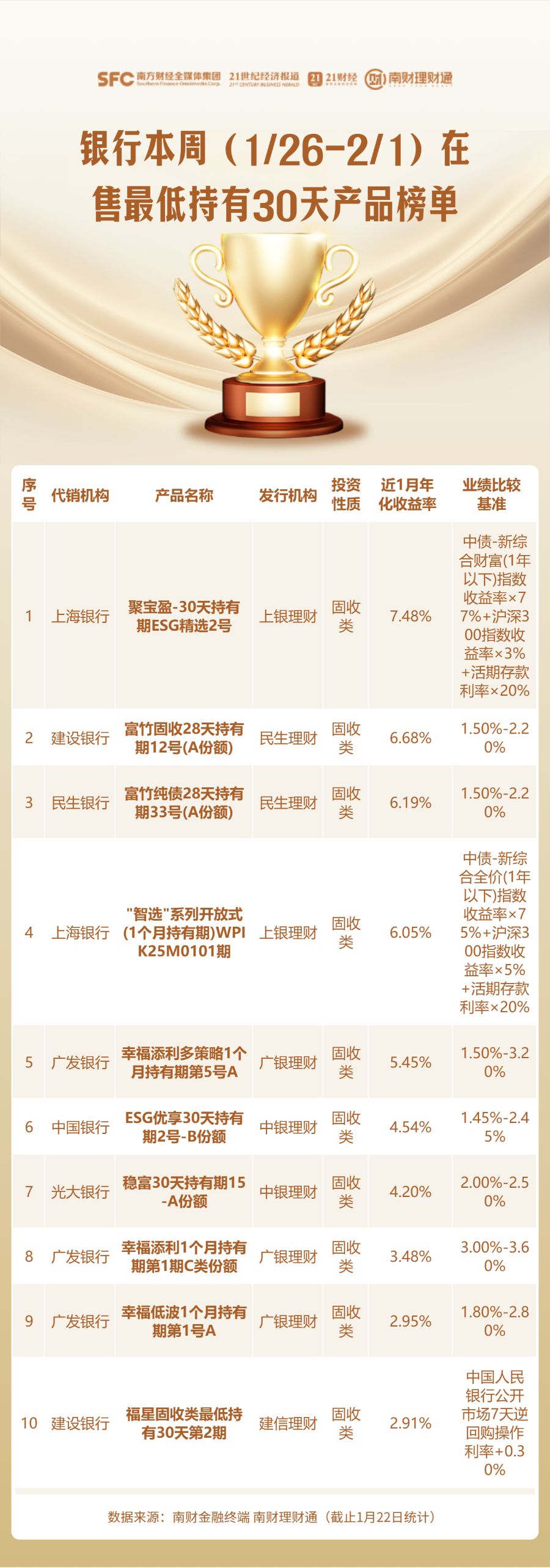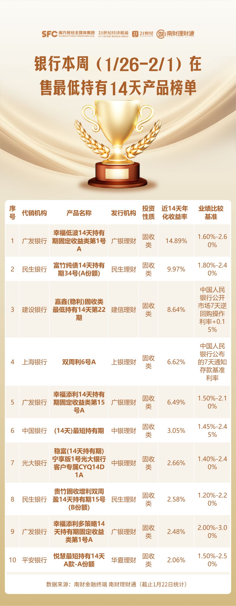 本期,南财理财通重点关注最低持有期人民币公募产品的业绩表现,按照7天、14天、30天、60天持有期限分类对产品业绩进行排名,业绩指标采用年化收益率,计算区间与持有期限相同,如30天持有期产品的业绩计算区间为近一月年化收益率,同机构同系列同投资周期产品保留一只参与排名。