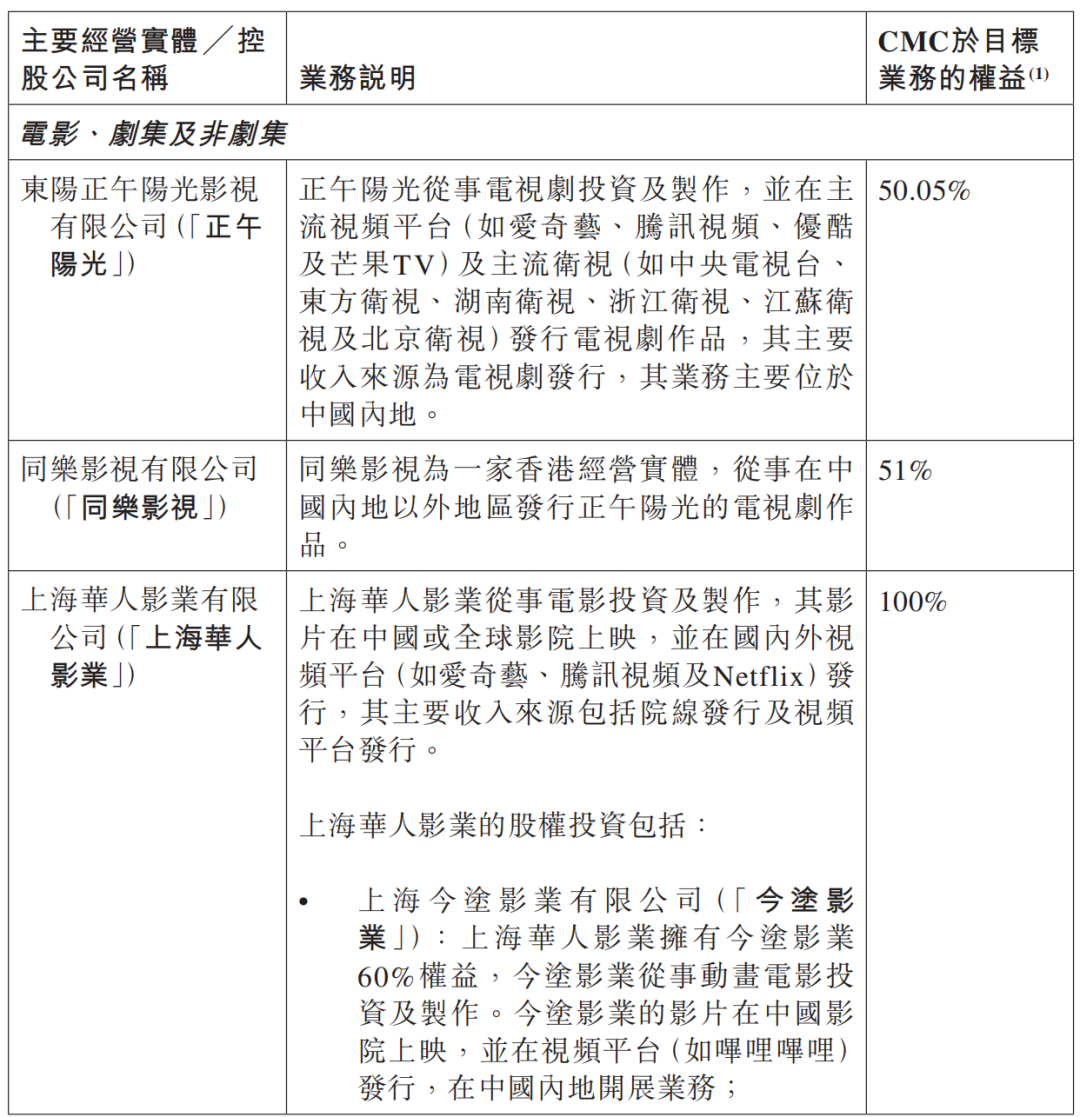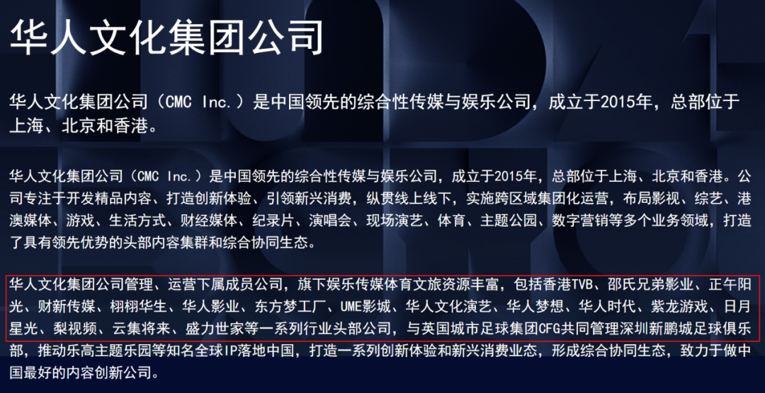 公告显示,本次收购目标业务为华人文化核心影视资产。首先,是覆盖海内外市场的影视内容业务,包括电影、剧集及非剧集内容的开发、制作、投资与发行,具体由正午阳光、上海华人影业、Pearl Studio等知名运营主体组成;其次,是以UME品牌为核心的影院业务,UME在中国内地运营超过50家影院,并拥有电影发行院线,形成“内容制作-发行-放映”的纵向布局。