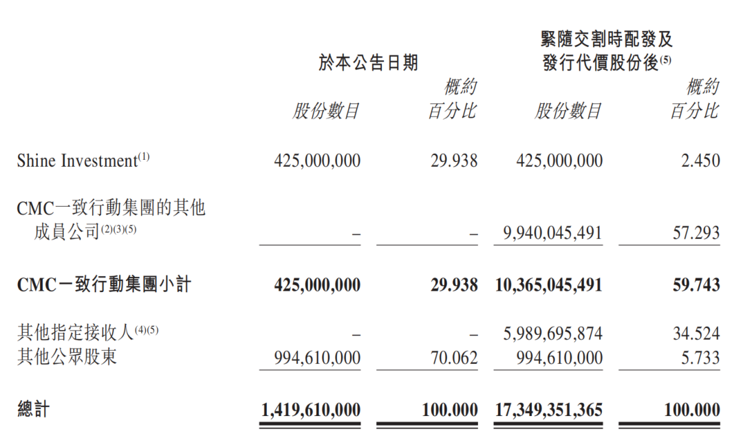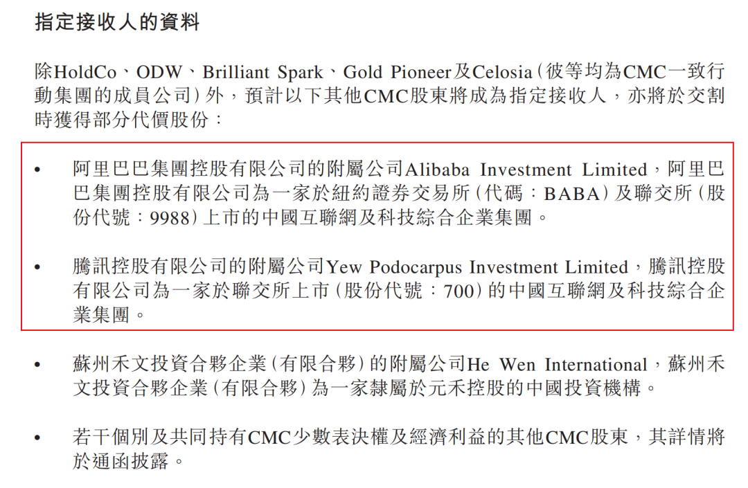 为满足港交所上市规则主板上市公司公众持股比例不得低于25%的要求,本次交易的部分代价股份将按华人文化股东在华人文化的原有持股比例进行配发。具体来看,华人文化一致行动集团的成员公司接收99.40亿股,其他指定接收人接收59.90亿股。其中,其他指定接收人包括华人文化创始股东阿里巴巴、腾讯的附属公司。