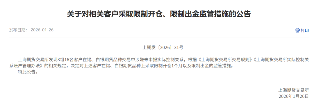 1月26日,上期所发布通知,根据《上海期货交易所风险控制管理办法》的有关规定,经研究决定, 自2026年1月27日(即1月26日夜盘)交易起,非期货公司会员、境外特殊非经纪参与者、客户在白银、锡期货已上市合约的交易限额调整如下 : 白银期货AG2602、AG2603、AG2604、AG2605、AG2606、AG2607、AG2608、AG2609、AG2610、AG2611、AG2612、AG2701合约的日内开仓交易的最大数量为800手。 锡期货SN2602、SN2603、SN2604、SN2605、SN2606、SN2607、SN2608、SN2609、SN2610、SN2611、SN2612、SN2701合约的日内开仓交易的最大数量为200手。 实际控制关系账户组日内开仓交易的最大数量按照单个客户执行。套期保值交易和做市交易的开仓数量不受此限制。