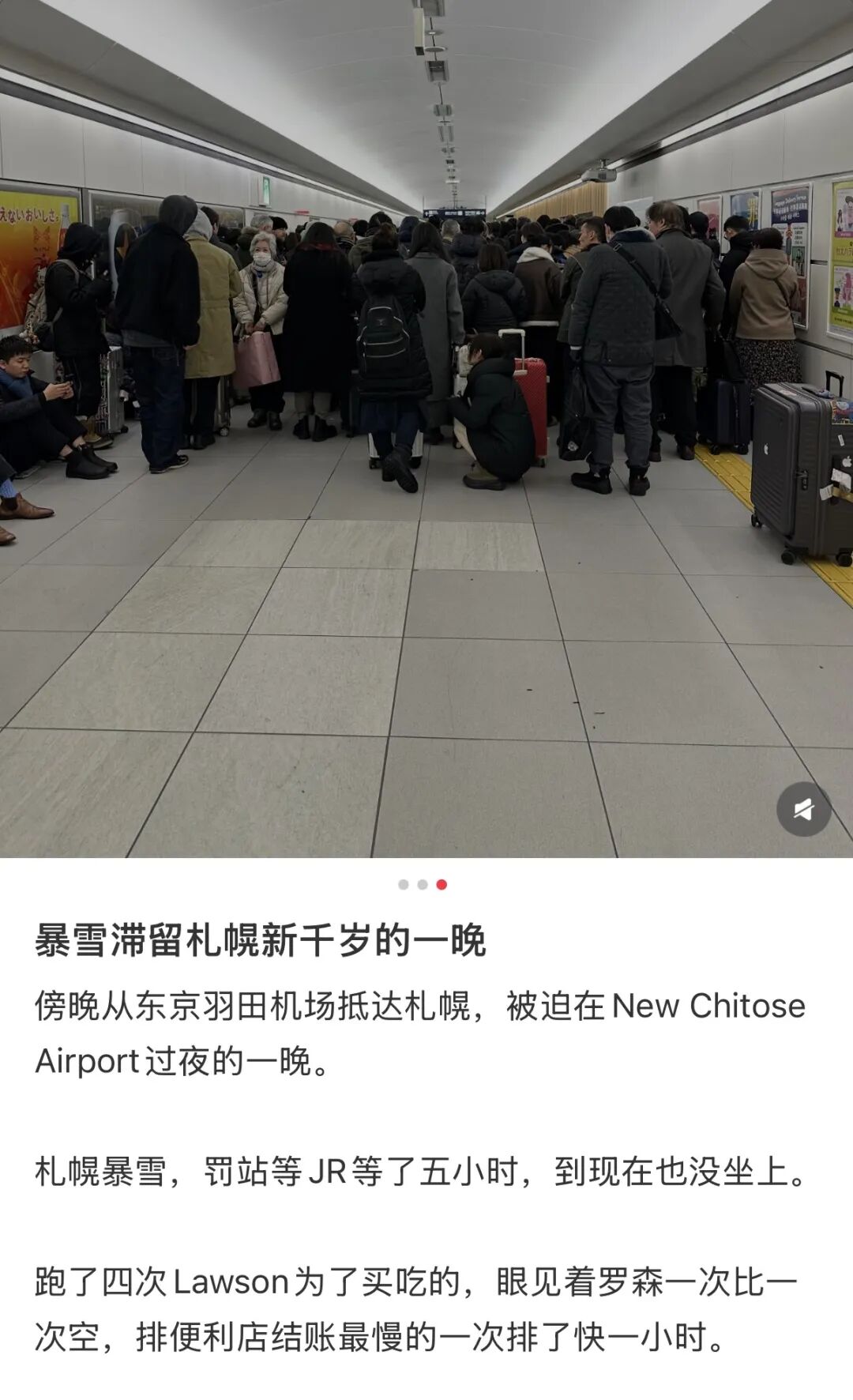 据报道,有人在社交媒体发文称机场的出租车候车点排起超过200人的长队,“简直是灾难”。 在札幌站附近一条地下通道里,25日晚约有340人过夜。