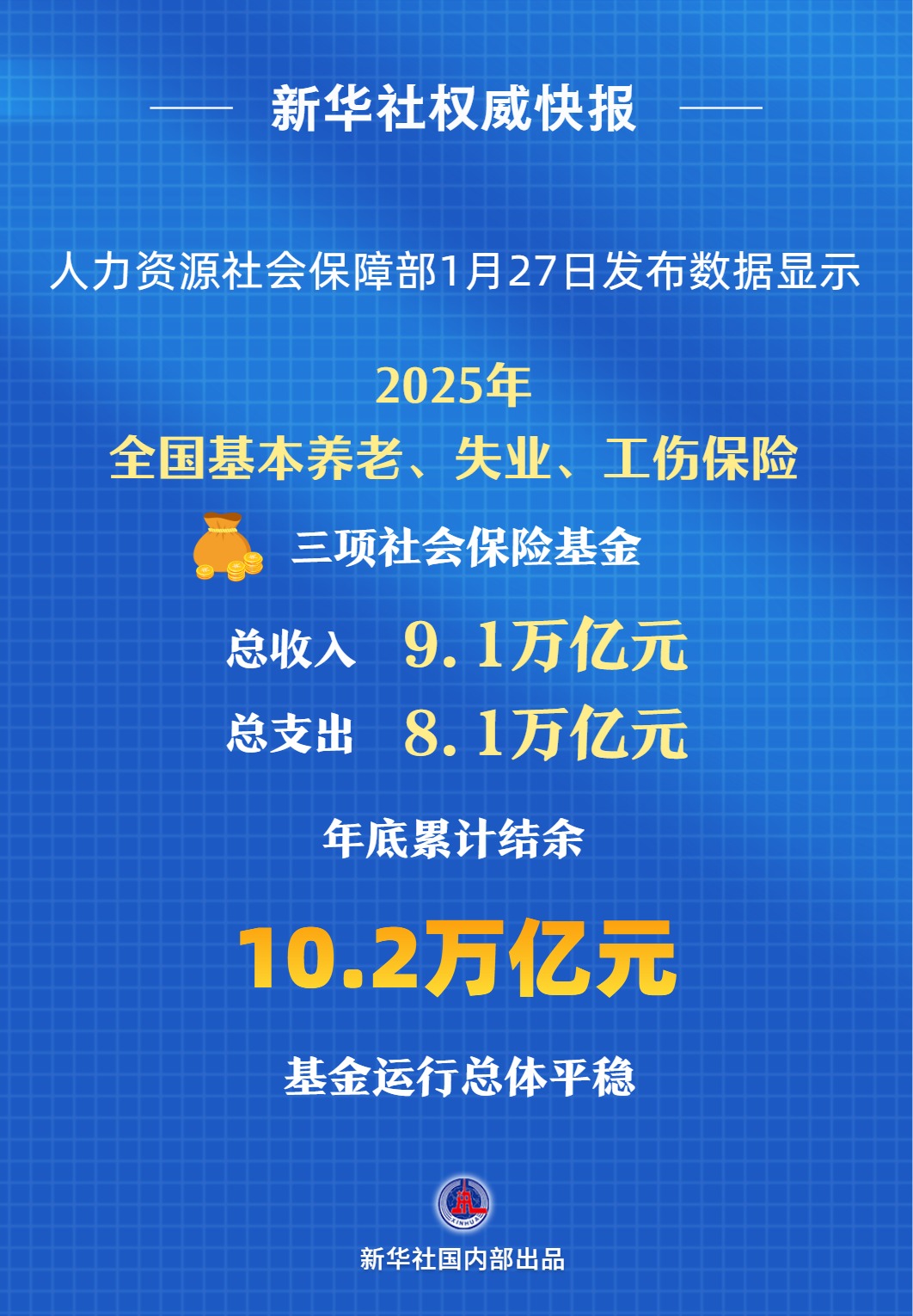 人力资源社会保障部1月27日发布数据显示,截至2025年底,全国基本养老、失业、工伤保险参保人数分别为10.76亿人、2.49亿人、3.05亿人,分别比上年底增加316万人、329万人、102万人。全年三项社会保险基金总收入9.1万亿元、总支出8.1万亿元,年底累计结余10.2万亿元,基金运行总体平稳。