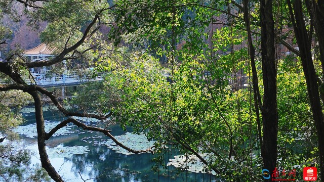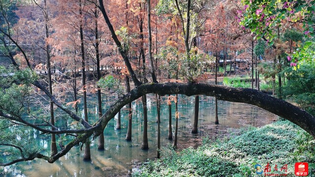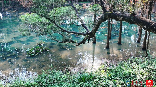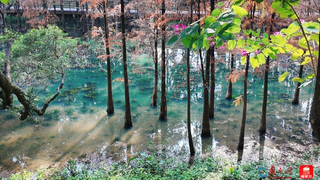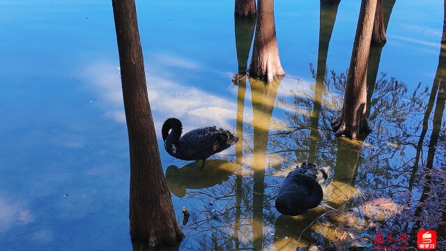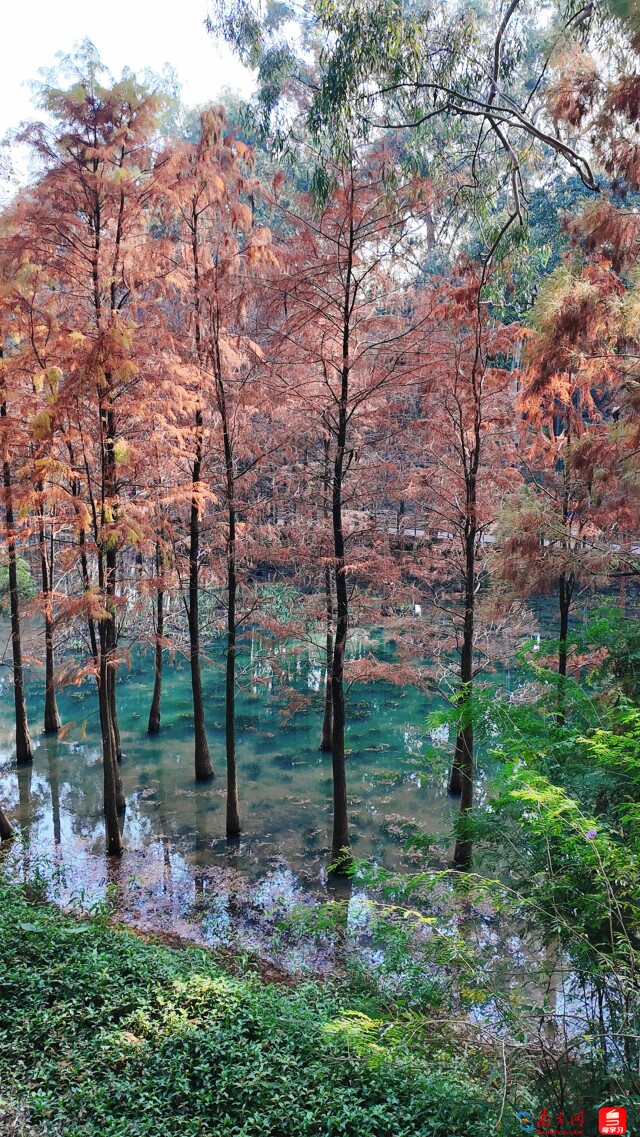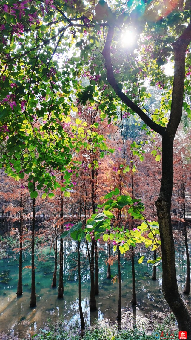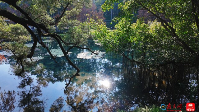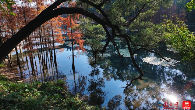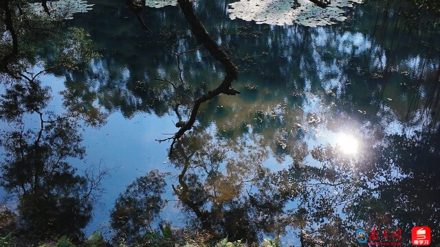 湖畔的树木倒映在平静的水面上,深浅不一的墨色层层晕染,阳光透过树梢,又在“画纸”上洒下点点金光,实景比照片还震撼,记者仿佛一脚踏入了一幅徐徐展开的宣纸画卷。