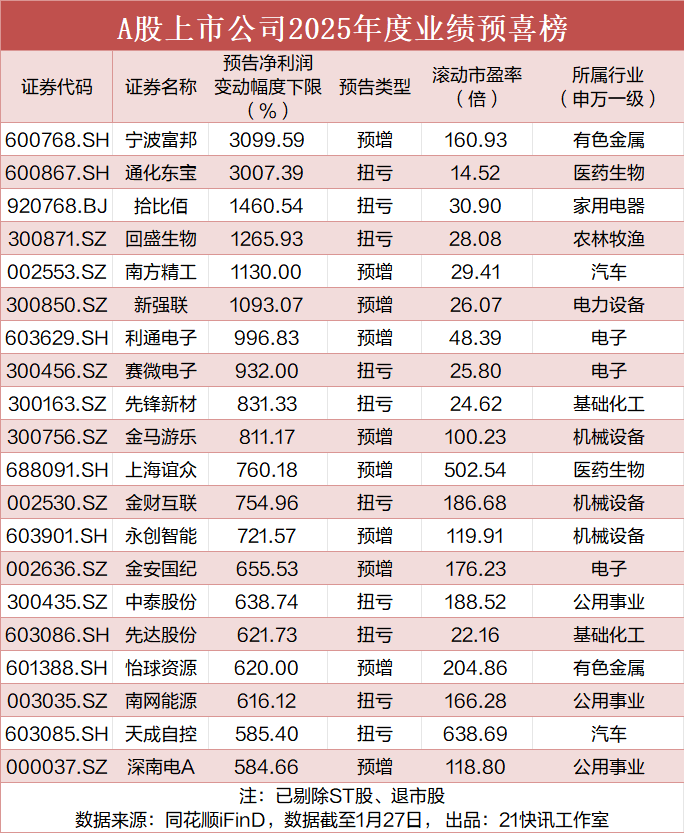 1月28日,21快讯记者注意到,今年以来,已有多家A股公司披露的2025年业绩“预喜”。其中,受有色金属涨价等因素影响,宁波富邦(600768.SH)净利润预计同比增长3099.59%至4379.43%,怡球资源(601388.SH)净利润预计同比增长620%到970%。
