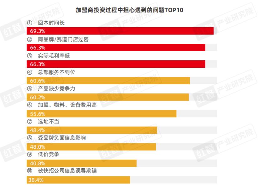 加盟商投资过程中,最担心引发投资失败的三大问题依次为回本时间过长、同品牌/赛道门店密度过密、实际毛利率偏低。