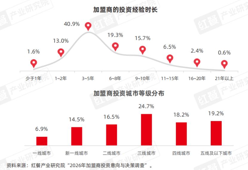 其中,成熟的职业加盟商年龄主要集中在31~40岁,他们的投资经营时长集中在3~5年,占比40.9%。在区域分布上涵盖各个等级的城市,其中三线城市占比较高,占比24.7%。