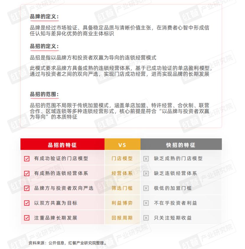 其次,在加盟模式方面,“快招”模式逐步出清,行业向品招模式转型。我国的连锁加盟行业在发展的过程中,出现了一些加盟乱象,其中“快招”品牌的“割韭菜”行为,给整个加盟行业的发展带来了负面影响,使得真正有实力、有诚意的品牌在拓展市场时面临更大的挑战,行业迫切需要完善优质项目的标准和特征。