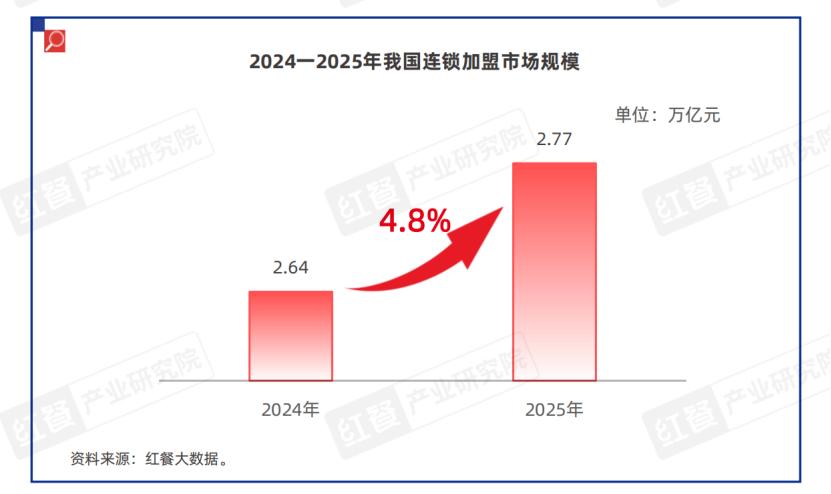 在此背景下,我国连锁加盟行业保持着稳步扩张的态势。据红餐产业研究院测算,2025年,我国连锁加盟市场规模约为2.77万亿元,同比增长4.8%。