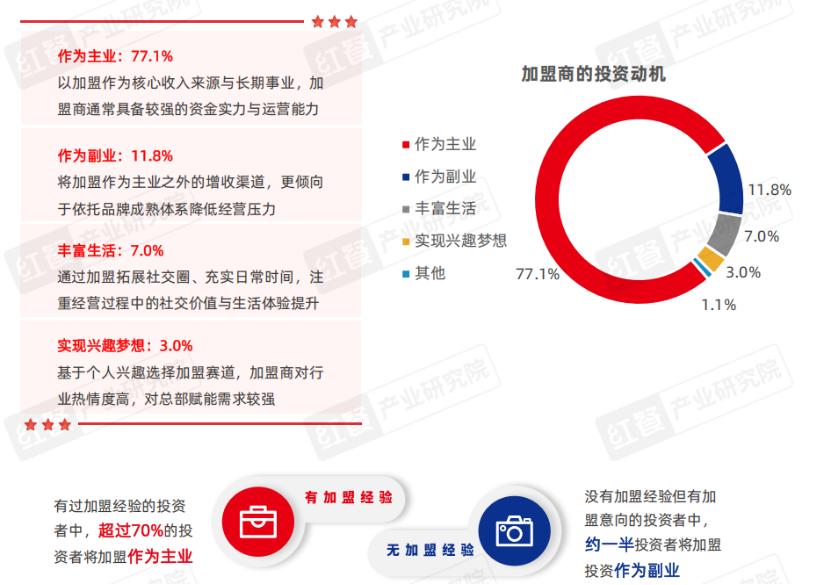 在投资动机方面,据红餐产业研究院调研,77.1%的加盟商将加盟作为主业,以此作为主要收入来源;11.8%的加盟商将其作为副业,是增收的一种方式;另有7.0%和3.0%的加盟商分别出于丰富生活、实现兴趣梦想的目的参与加盟。