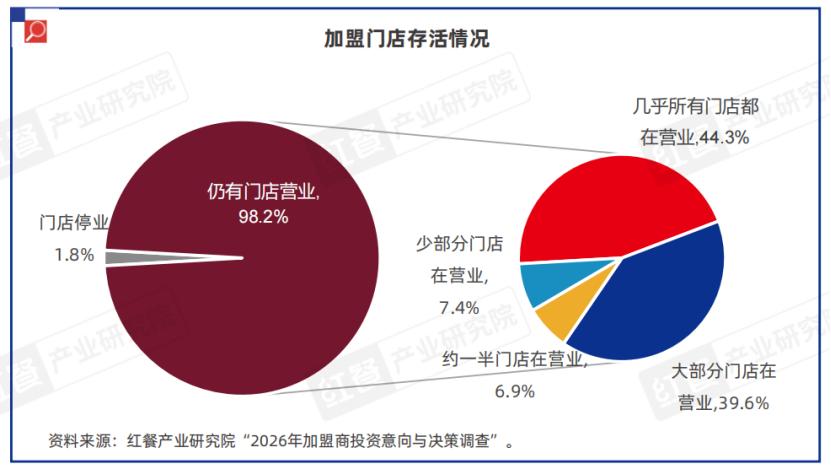 在门店存活状态方面,加盟门店的经营状态整体较好,行业内门店存活的基础盘较为稳固,反映出加盟模式在经营持续性上具备一定优势。据红餐产业研究院调研,仅1.8%的加盟商表示其所有门店已停业,44.3%的加盟商表示其所有门店正常营业,39.6%的加盟商表示其大部分门店处于营业状态。