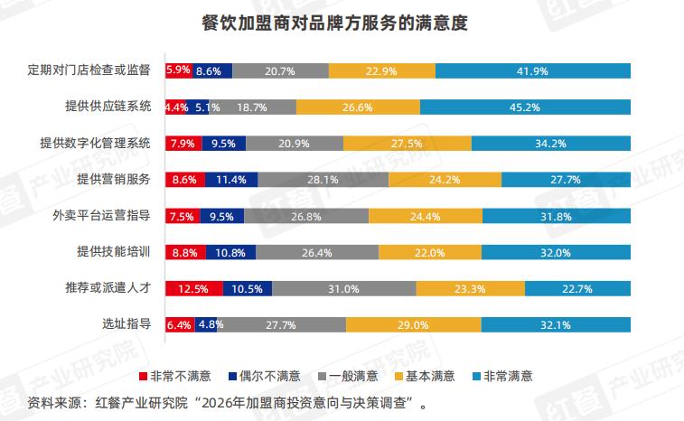 在总部赋能方面,品牌方在基础供应链能力上已形成优势,但在人才配套服务方面仍有优化的空间。例如,在餐饮行业中,加盟商对品牌方服务的满意度呈分化状态:供应链系统满意度最高,近五成加盟商给出“非常满意”评价,仅4.4%加盟商表示“非常不满意”;人才推荐/派遣的满意度最低,仅22.7%加盟商表示“非常满意”,“非常不满意”占比达12.5%。