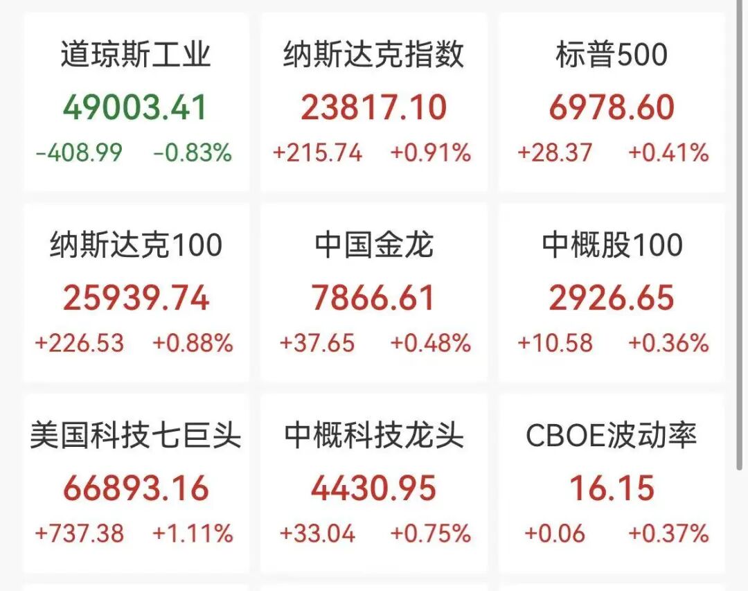 周二(1月27日),美国三大股指收盘涨跌不一,科技股表现强劲带动纳指和标普上涨。截至收盘,道指跌0.83%报49003.41点,标普500指数涨0.41%报6978.6点,纳指涨0.91%报23817.1点。