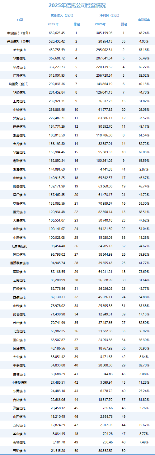 2025年,信托行业呈现营收净利双增但内部分化加剧的格局。